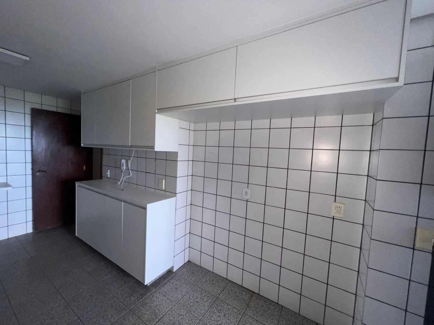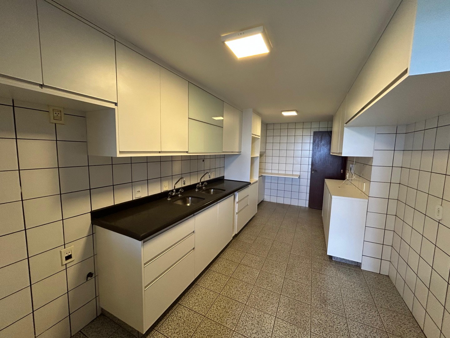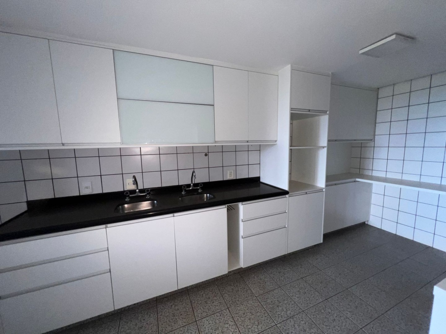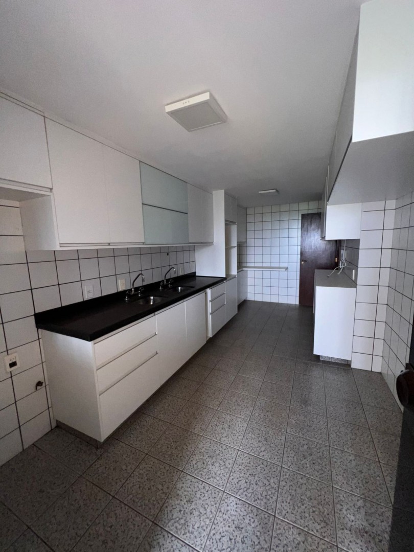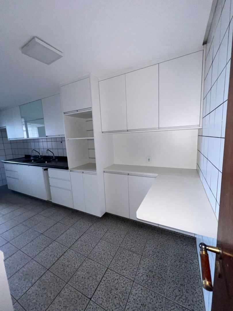 A cozinha é espaçosa, equipada com armários sob medida,