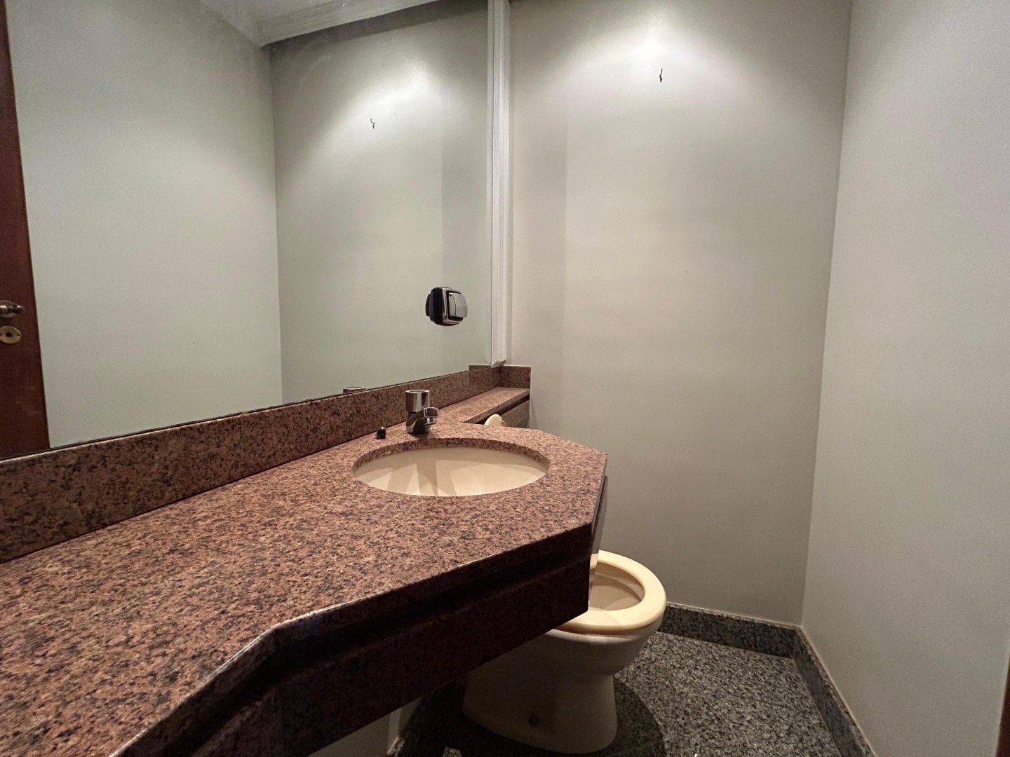 A sala é ampla, com piso em granito,